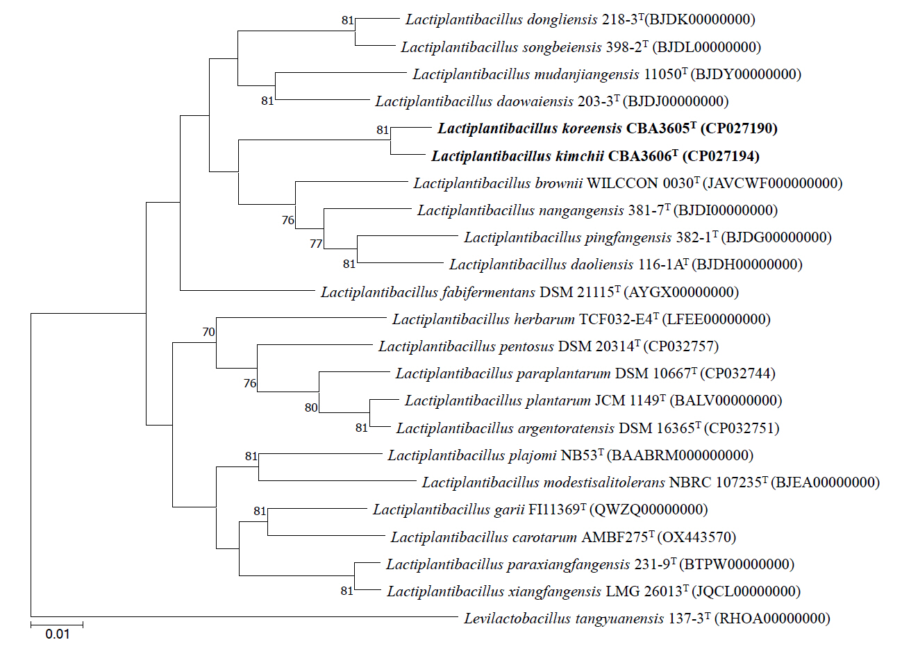 The results of phylogenetic analyses based on 16S rRNA gene and genome sequences, as well as physiological and chemotaxonomic assessments, clearly demonstrate that strains CBA3605T and CBA3606T belong to the genus Lactiplantibacillus. The two strains have genome-based relatedness measures (ANI and dDDH) of 91.7% and 45.0%, respectively, which are well below the generally accepted species thresholds of 95–96% and 70%. Additionally, several distinct phenotypic characteristics suggest that strains CBA3605T and CBA3606T represent different novel species not recognized within the genus Lactiplantibacillus. In conclusion, based on the phylogenetic, physiological, and chemotaxonomic evidence, we propose the names Lactiplantibacillus koreensis sp. nov. for strains CBA3605T and Lactiplantibacillus kimchii sp. nov. for strains CBA3606T.