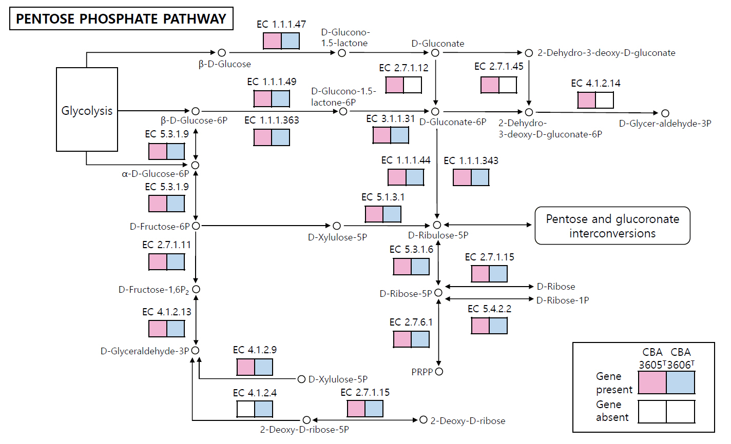 Fig. 3.Reconstructed pentose phosphate pathway of strains CBA3605T and CBA3606T. Pink and blue boxes indicate genes present in strain CBA3605T and CBA3606T, respectively, while white boxes denote the absence of the corresponding genes. Genes absent in both strains are not shown.