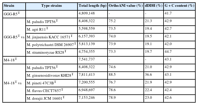 Genomic DNA was extracted from both strains using a Maxwell® RSC Tissue DNA Extraction Kit (Promega, Korea). Pacbio Sequel-Ⅱ sequencing platform (Pacific Biosciences, USA) and Illumina NovaSeq6000 150PE instrument (Illumina, USA) at Macrogen (Republic of Korea) were used for whole genome sequencing of both strains. The sequence reads were assembled using HiFiasm v. 0.16.0 where PacBio long-read data was preliminarily used and Illumina reads were used to resolve gaps or repetitive regions. Genome completeness analysis using BUSCO (Manni et al., 2021) and annotation based on Prokka (Seemann, 2014) were carried out using the Galaxy online server (The Galaxy Community, 2022). Further, genomes of strains GGG-R5T and M4-18T were annotated using the Rapid Annotation Subsystem Technology (RAST) version 2.0 (Brettin et al., 2015) and the NCBI prokaryotic genome annotation pipeline (PGAP) (Tatusova et al., 2016). The orthologous average nucleotide identity (OrthoANI) values (%) were calculated using OrthoANI in EzBioCloud (Yoon et al., 2017b). For other genome based taxonomic analyses, the genome sequence data was uploaded to the Type (Strain) Genome Server (TYGS) (Meier-Kolthoff and Göker, 2019). Information on nomenclature, synonymy and associated taxonomic literature was provided by TYGS's sister database, LPSN (Meier-Kolthoff et al., 2022). Genome-to-genome distance (GGDC) analysis was carried out using the GGDC calculator (Meier-Kolthoff et al., 2022). digital DNA:DNA hybridization (dDDH) was carried out as part of TYGS analyses and the values of d4 formula which calculates sum of all identities found in high-scoring segment pairs (HSPs) divided by overall HSP length reported independent of the genome length was reported. Genome based tree from TYGS was drawn with FastME 2.1.6.1 using Genome Blast Distance Phylogeny (GBDP) distances calculated from genome sequences and branch lengths were scaled in terms of GBDP distance formula d5. For genome derived bacterial core genes-based phylogenetic analysis, 92 up-to-date bacterial core genes were extracted from the genomes of neighboring species based on TYGS analyses followed by multiple-alignment, and construction of a phylogenetic tree using the up-to-date bacterial core gene (UBCG) tool ver. 3 (Na et al., 2018).