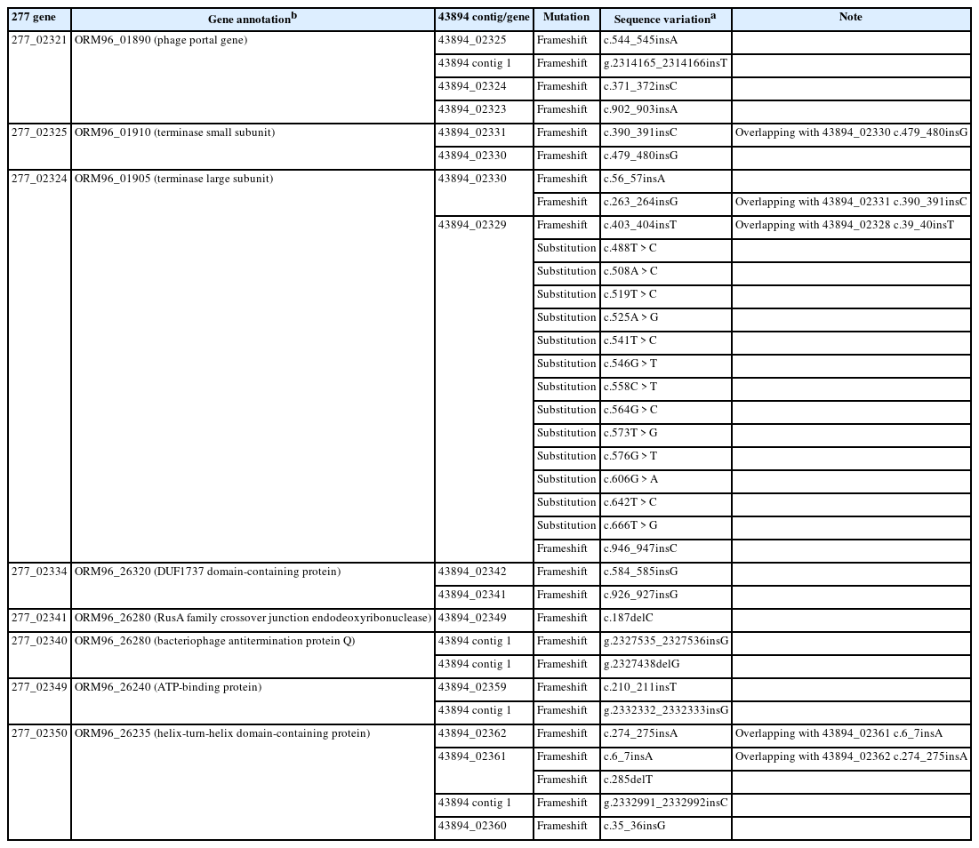 | 277_02325 | ORM96_01910 (terminase small subunit) | 43894_02331 | Frameshift | c.390_391insC | Overlapping with 43894_02330 c.479_480insG |