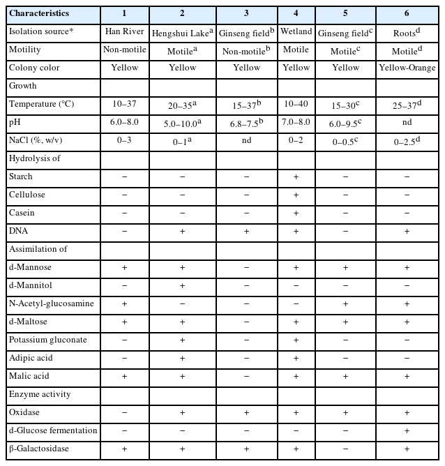 Cellular morphology of strains CJ20T and CJ99T were observed by transmission electron microscopy using cells grown for 2 days at 30℃ on TSA. Growth of both strains was tested at 30℃ for 48 h on Reasoner’s 2A agar (R2A), Nutrient agar (NA), Luria-Bertani (LB) agar, Marine agar (MA), and Tryptic Soy Agar (TSA). Optimal temperature for growth was determined on TSA at 4, 10, 20, 30, 37, 40, and 45℃, and optimal pH for growth was determined in tryptic soy broth (TSB) using 0.1 M citrate buffer for pH 4–5, 0.1 M phosphate buffer for pH 6–8, and 0.1 M carbonate/bicarbonate for pH 9. Halotolerance test was conducted in TSB supplemented with 0–4% (w/v) NaCl (at 1% interval). Anaerobic growth was determined after two weeks of cultivation at 30℃ on TSA using the GasPak Anaerobic Pouch System (BD). Cell motility was tested by incubating bacterial strains in semi-solid tryptic soy medium containing 0.4% agar. The flexirubin-type pigment test was carried out by placing colonies in 20% (w/v) KOH solution and interpreting changes in colony color. Hydrolysis of starch, cellulose, casein and DNA was tested using 1.0% (w/v) soluble starch (BD), 0.2% (w/v) carboxymethylcellulose (Sigma Aldrich), 3% (w/v) skimmed milk (BD), and DNA test agar (BD), respectively. After two days of incubation, hydrolysis of starch and cellulose was visualized by iodine, and casein and DNA were confirmed by the transparency of the medium. Oxidase and catalase activities were performed using the oxidase reagent (bioMérieux) and 3% (v/v) aqueous H2O2 solution, respectively. Assimilation and enzyme activity tests were performed using API 20NE according to the manufacturer’s instructions (bioMérieux).