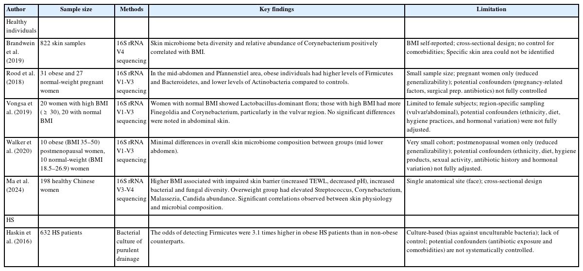 | Vongsa et al. (2019) | 20 women with high BMI (≥ 30), 20 with normal BMI | 16S rRNA V1-V3 sequencing | Women with normal BMI showed Lactobacillus-dominant flora; those with high BMI had more Finegoldia and Corynebacterium, particularly in the vulvar region. No significant differences were noted in abdominal skin. | Limited to female subjects; region-specific sampling (vulvar/abdominal), potential confounders (ethnicity, diet, hygiene practices, and hormonal variation) were not fully adjusted. |