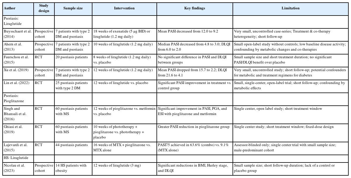 | Lin et al. (2022) | RCT | 25 psoriasis patients with type 2 DM | 12 weeks of liraglutide vs. placebo | Significant PASI improvement in treatment vs. control group | Small, single-center, open-label trial; short follow-up; confounding by metabolic effects |