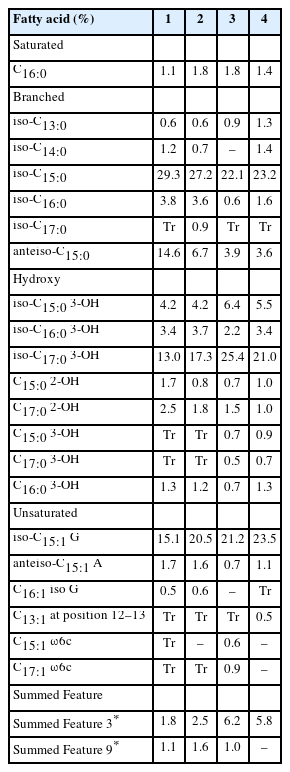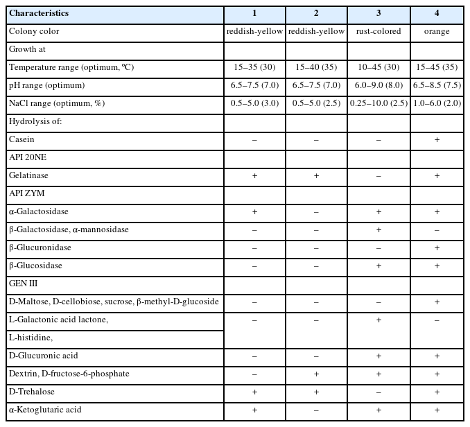 Strains: 1, IMCC43444T; 2, IMCC44478T; 3, R. biformata KCTC 12146T; 4, R. sediminis KCTC 52898T. Data were obtained from this study. All strains positive for degradation of Tween 20 and Tween 80, and enzyme activities for catalase, oxidase, esculin hydrolysis (β-glucosidase), PNPG (β-galactosidase), alkaline phosphatase, esterase (C4), esterase lipase (C8), lipase (C14), leucine arylamidase, valine arylamidase, cystine arylamidase, trypsin, α-chymotrypsin, acid phosphatase, and naphthol-AS-BI-phosphohydrolase. Detailed carbon source oxidation pattern is summarized in Table S2. +, Positive; ‒, negative.