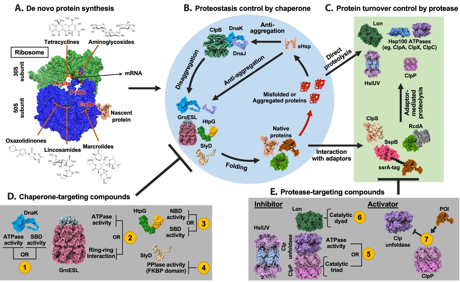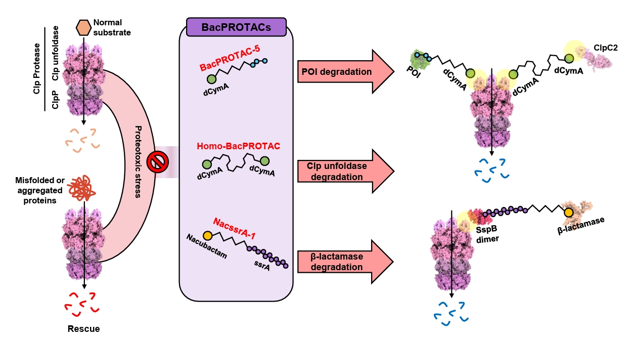 | CymA | NTD of ClpC1 | Induce formation of large ClpC1 supercomplexes and activate associated ClpP protease via N-terminal domain binding | Taylor et al. (2022); Vasudevan et al. (2013) | |