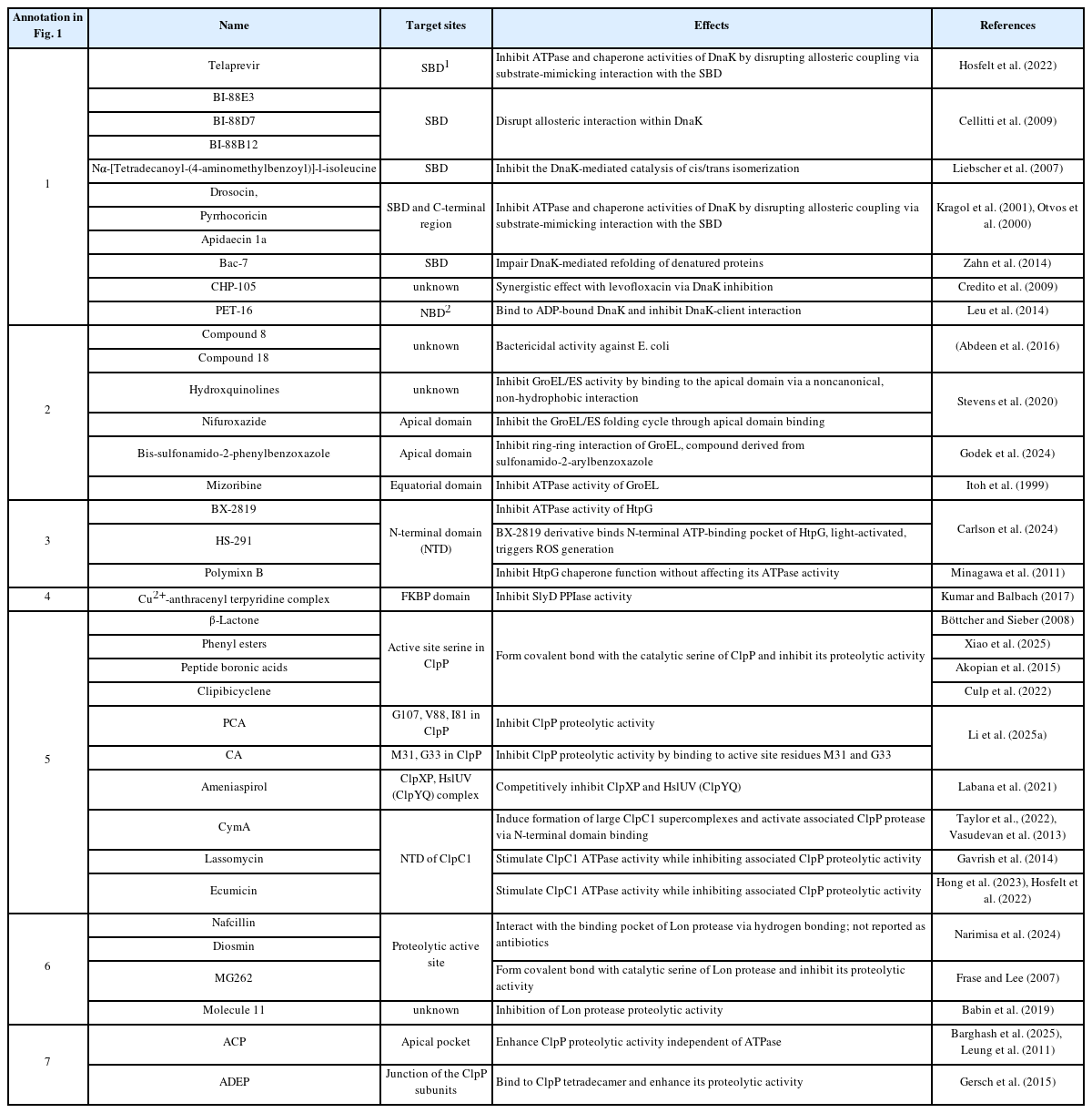 | 1 | Telaprevir | SBD | Inhibit ATPase and chaperone activities of DnaK by disrupting allosteric coupling via substrate-mimicking interaction with the SBD | Hosfelt et al. (2022) |