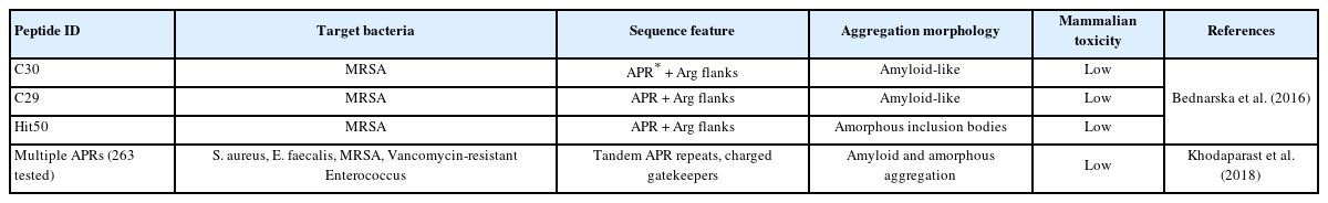 | C30 | MRSA | APR* + Arg flanks | Amyloid-like | Low | Bednarska et al. (2016) |