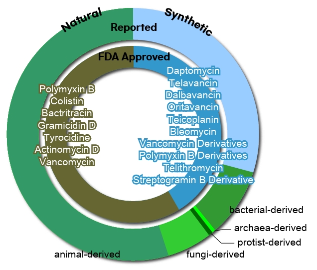 Fig. 1. Landscape of approved and reported peptide antibiotics. The inner diagram represents FDA-approved peptide antibiotics (seven natural and ten synthetic agents) and the outer diagram shows reported peptides with documented antimicrobial activity, most of which are animal- or bacterial-derived. Blue shades indicate synthetic or semi-synthetic peptides, whereas green shades correspond to naturally derived peptides of bacterial or animal origin. This classification highlights the dominance of naturally derived scaffolds among approved drugs and the growing diversity of synthetic analogs under investigation. The data are from the Antimicrobial Peptide Database (APD6) (Wang et al., 2025b).