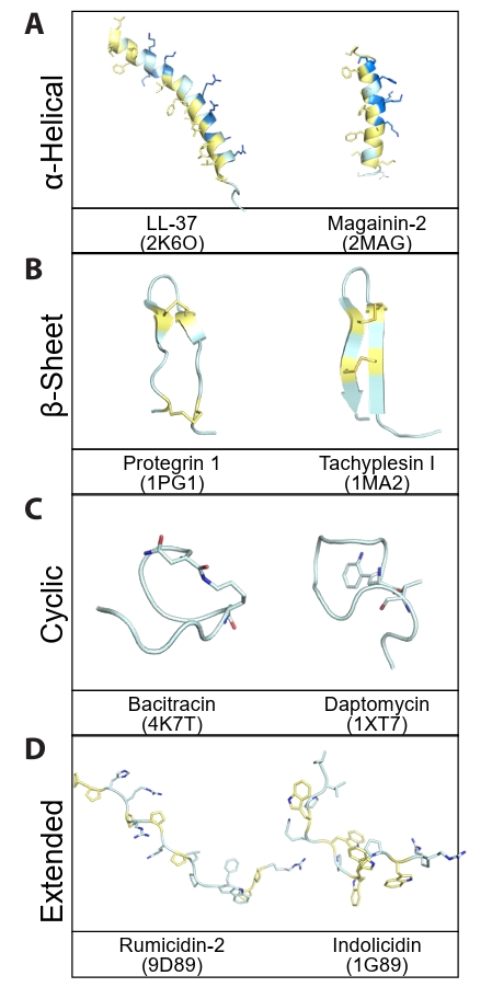 Fig. 2. Representative peptide antibiotics with experimentally resolved structures. (A) α-Helical peptides typically exhibit amphipathic character, with one face composed of hydrophobic residues shown in yellow and the opposite enriched in positively charged residues shown in blue. (B) β-Sheet peptides often contain disulfide (colored in yellow) or covalent linkages that stabilize the overall structure. (C) Cyclic peptides are cross-linked through various intramolecular bonds; the examples shown include Lys-Asn and kynurenine-Thr linkers. (D) Extended peptides frequently feature repetitive amino acid motifs, exemplified here by sequences rich in Pro and Trp residues. All structures were obtained from the Protein Data Bank (PDB; IDs in parentheses) and visualized using PyMOL. The color scheme highlights hydrophobic (yellow) and cationic (blue) residues to emphasize amphipathic architecture.