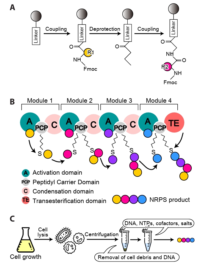Fig. 4. Representative approaches for peptide synthesis. This figure provides a simplified schematic of peptide synthesis methods. Together, these panels highlight the conceptual differences between chemical, enzymatic, and cell-free peptide synthesis strategies. (A) Classical solid-phase peptide synthesis (SPPS) illustrates the stepwise chemical coupling of amino acids, exemplified by the first two residues. (B) Non-ribosomal peptide synthetase (NRPS) pathway depicts the modular enzymatic assembly of peptide chains, where A, C, PCP, and TE denote adenylation, condensation, peptidyl carrier protein, and thioesterase domains, respectively. (C) Cell-free protein synthesis (CFPS) represents the in vitro translation-based production of peptides without living cells.