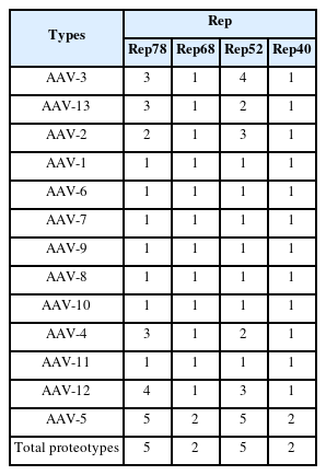 The amino acid sequences of 9 proteins encoded by the Rep and Cap genes for 13 AAVs were aligned using the Muscle algorithm, and each phylogenetic tree was created with MEGA 11 software using the maximum likelihood method. Using the SnapGene viewer program (https://www.snapgene.com/snapgene-viewer), the consensus sequence was established from the aligned amino acid sequences, applying a threshold of more than 50%. In the data, consensus sequences were marked in white, while gaps were indicated in black. If the amino acid sequence between the two types showed a divergence exceeding 10% relative to the total amino acid sequence, they were classified as different proteotypes. A unique color was designated for each amino acid.