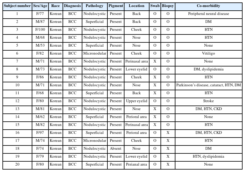This pilot study was conducted at the Department of Dermatology, Incheon St. Mary’s Hospital, The Catholic University of Korea, between July 2021 and December 2022. Twenty Korean patients with histologically confirmed BCC were enrolled after providing written informed consent (Table 1). Exclusion criteria included systemic antibiotic use within four weeks or topical antibiotic application within two weeks prior to sampling. The study was approved by the institutional ethics committee (OC21TISI0038).