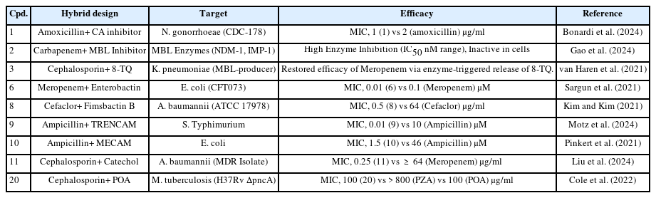 Table 1.Representative β-lactam-based antibiotic hybrids and their comparative efficacy