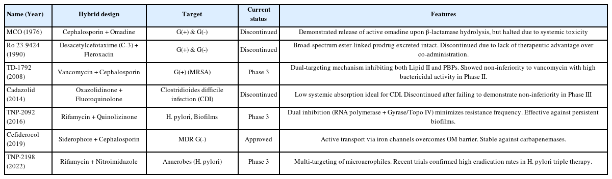 As summarized in Table 3, several antibiotic hybrids have progressed to clinical evaluation (Fig. 5). This section reviews representative candidates in chronological order of their development, highlighting their design rationale and clinical outcomes.