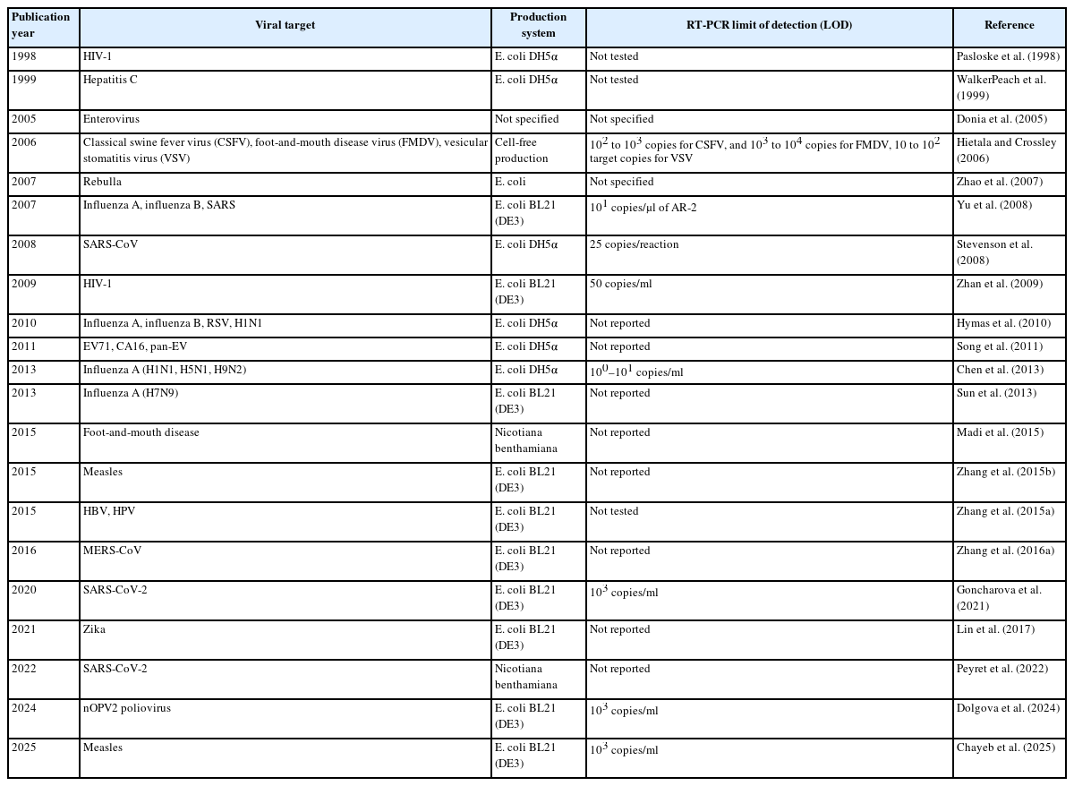 | Publication year | Viral target | Production system | RT-PCR limit of detection (LOD) | Reference |