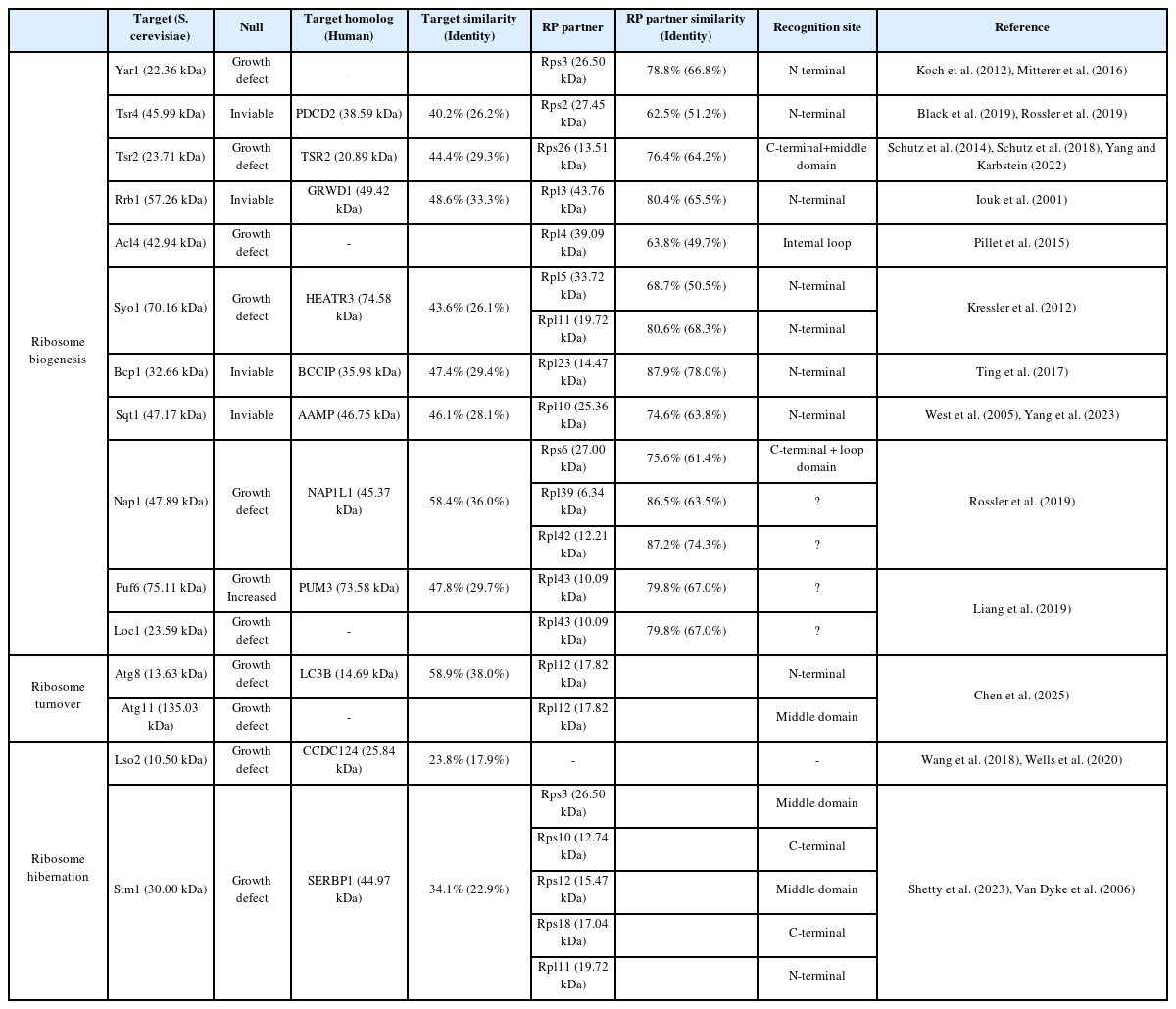 The process of ribosome biogenesis is largely conserved from yeast to human (Ameismeier et al., 2018; Fiorentino et al., 2025; Tomecki et al., 2017; Wild et al., 2010), together with the assembly factors as well (Dorner et al., 2023). Out of ~200 assembly factors identified, a subset of chaperone proteins has been classified based on their function. While RPs are relatively small and basic proteins, they are prone to aggregate when they fail to incorporate into ribosomes (Gorenstein and Warner, 1977; Sung et al., 2016; Warner, 1977). To prevent misfolding and ensure efficient ribosome assembly of these RPs, subset of “personalized” chaperones have been identified in yeast, interacting with one or more of 13 specific RPs (Table 1) (Iouk et al., 2001; Koch et al., 2012; Kressler et al., 2012; Mitterer et al., 2016; Pillet et al., 2015; Schutz et al., 2014; Stelter et al., 2015; Ting et al., 2017; West et al., 2005; Yang and Karbstein, 2022). While most of these personalized RP chaperones have human homologs (Yang et al., 2023), due to its substantial study performed in yeast, it remains unclear whether all these human homologs retain the same client specificity as their yeast counterparts.