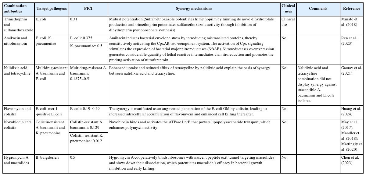 | Combination antibiotics | Target pathogens | FICI | Synergy mechanisms | Clinical uses | Comments | Reference |